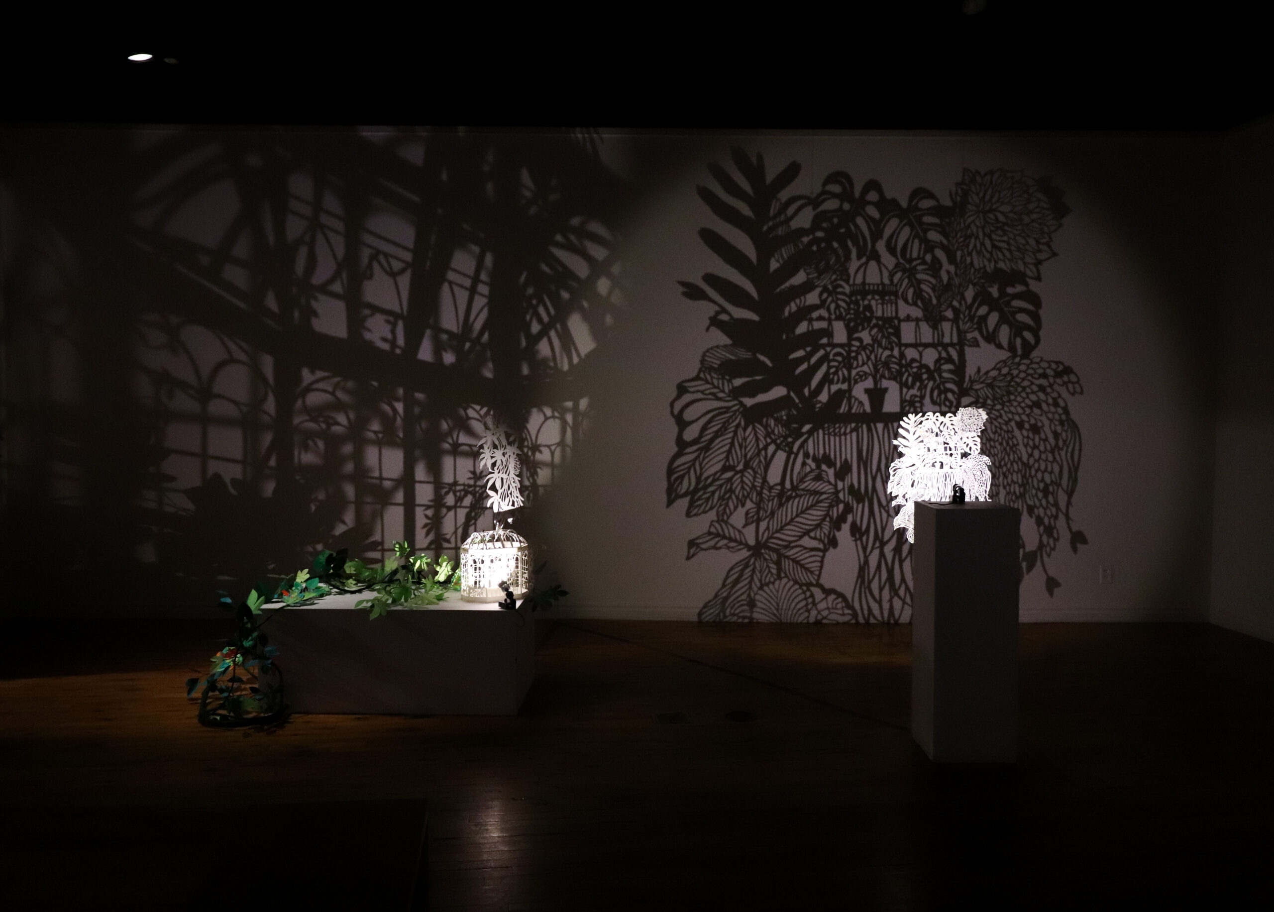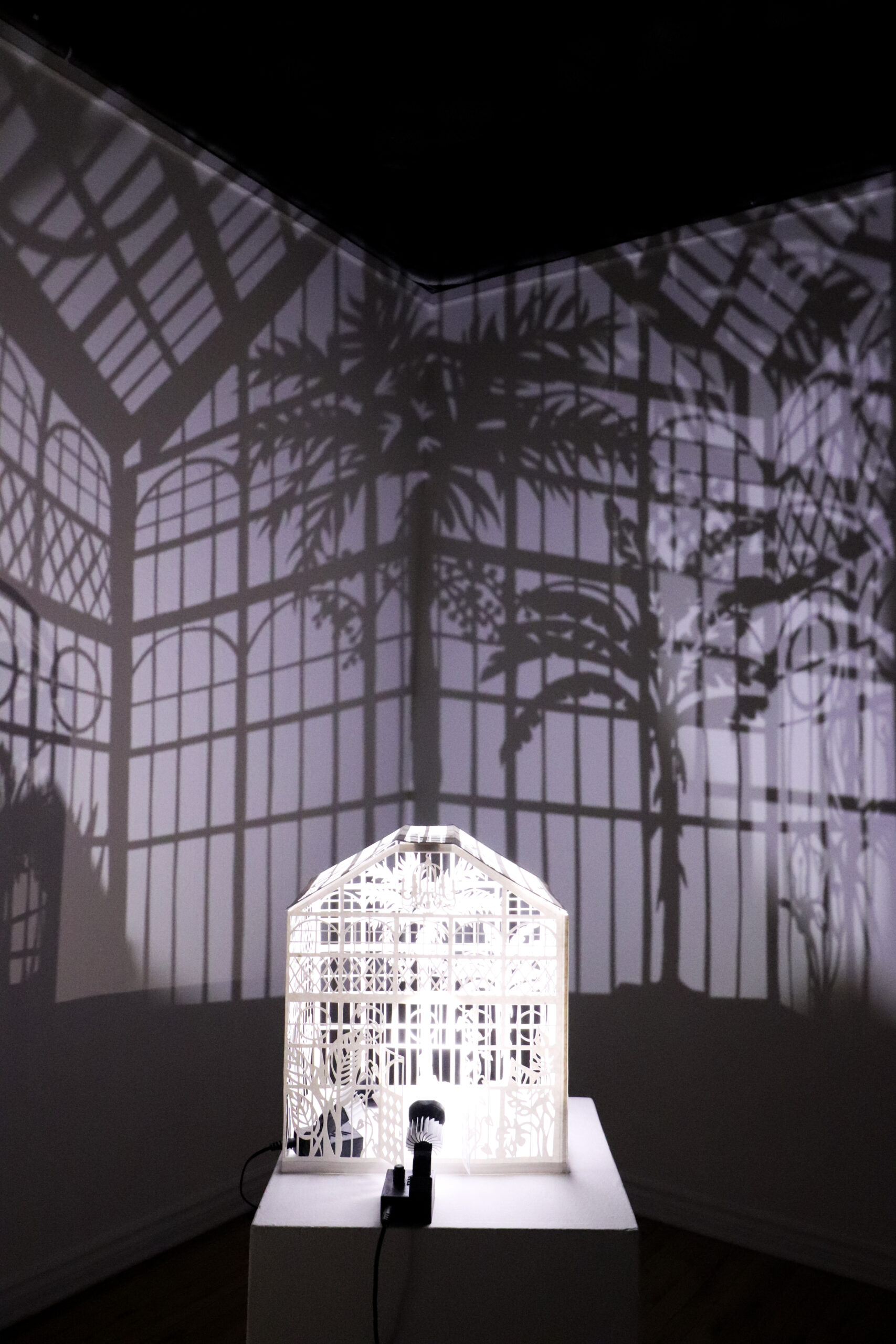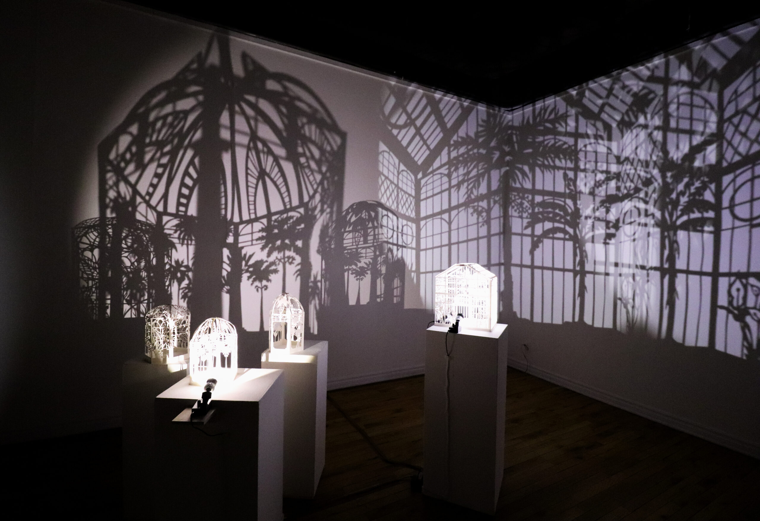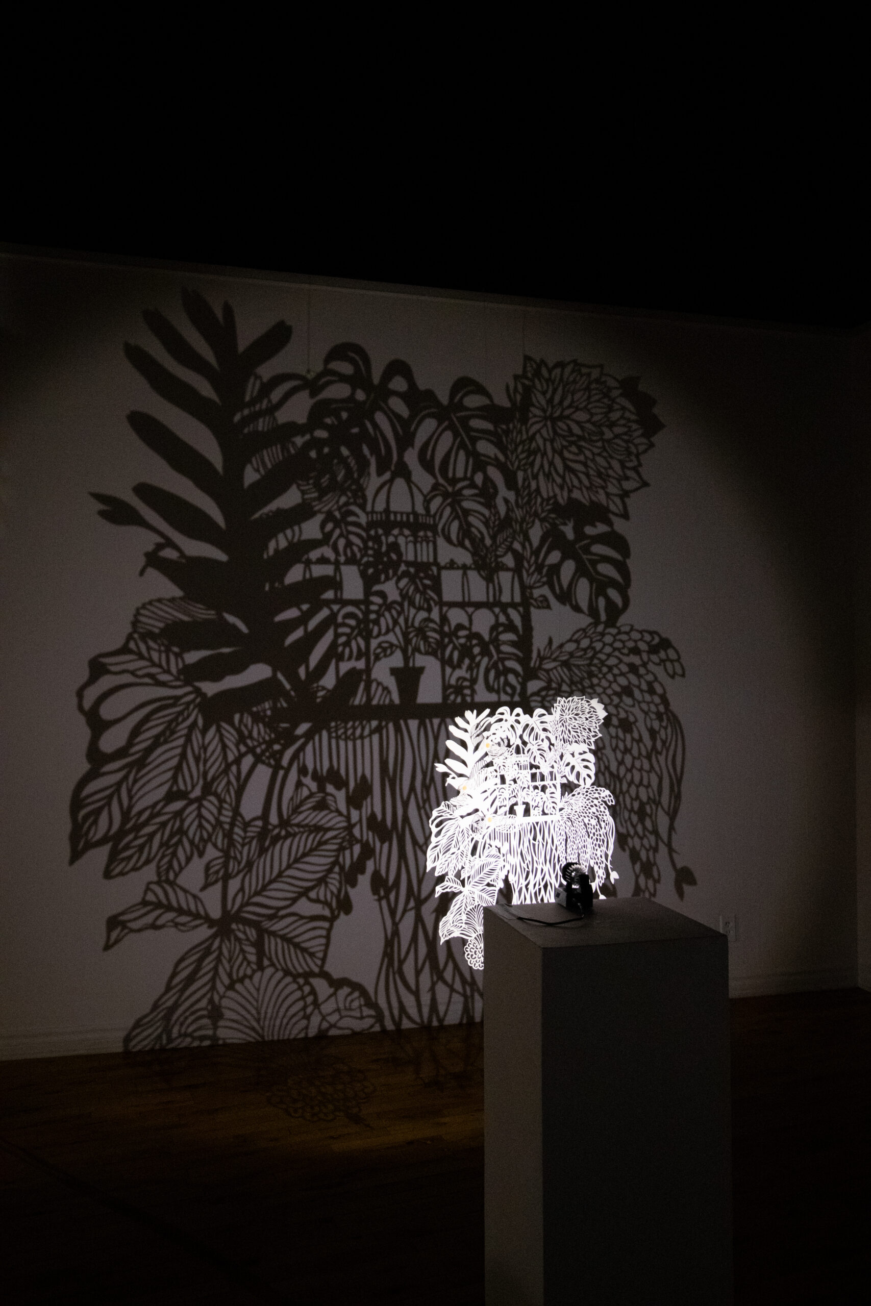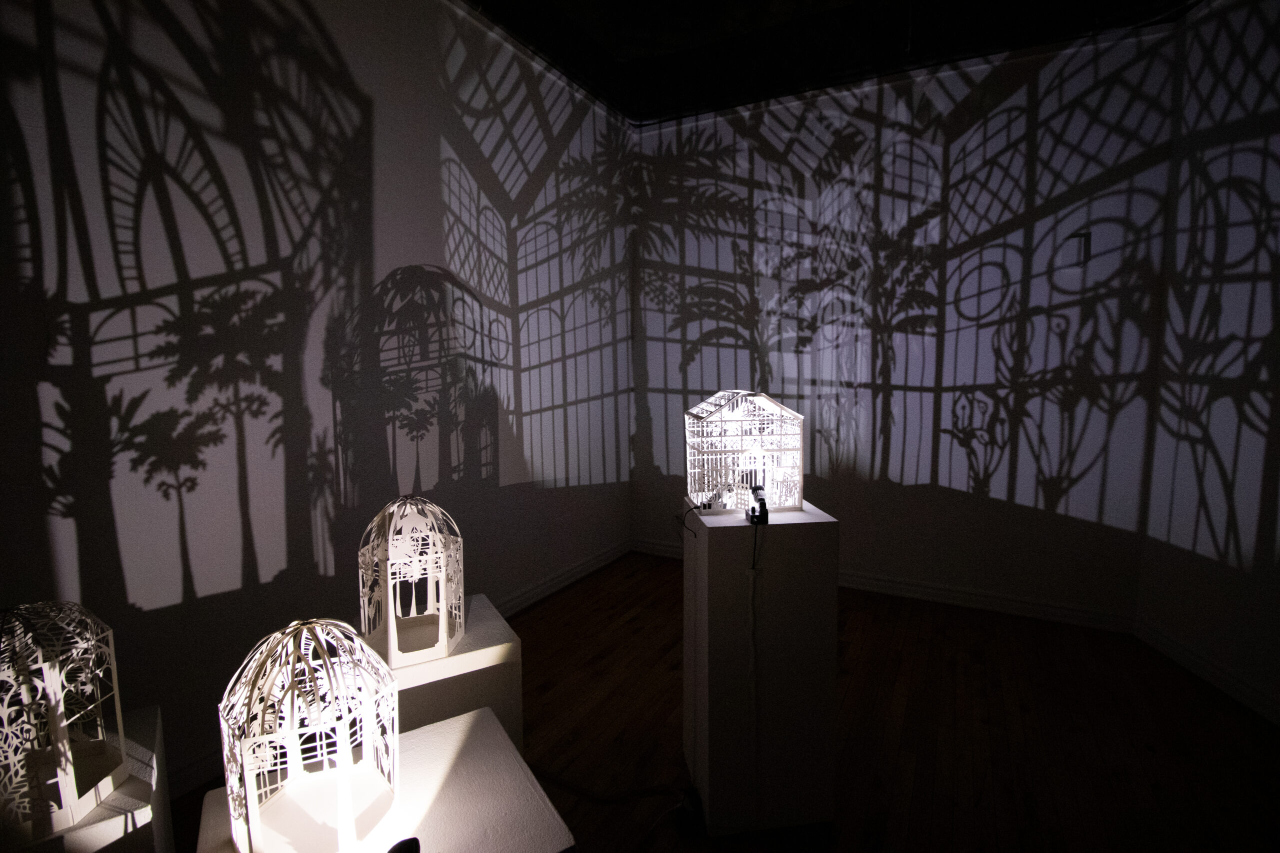 Winter Garden is a large-scale immersive shadow installation that explores historical structures built to possess and colonize plants from all over the world. First built in 19th-century Europe, winter gardens were structures made of cast iron and plate glass to house collections of exotic foliage. These indoor gardens served as a testament to the power and wealth of those with the means to possess them, and to the power and technological knowledge possessed by whomever built them. This exhibition at the McClure Gallery combines the delicacy of cut paper with imagery inspired by historical winter garden structures at two Montreal locations: The Verdun Greenhouses and the Montreal Botanical Gardens.