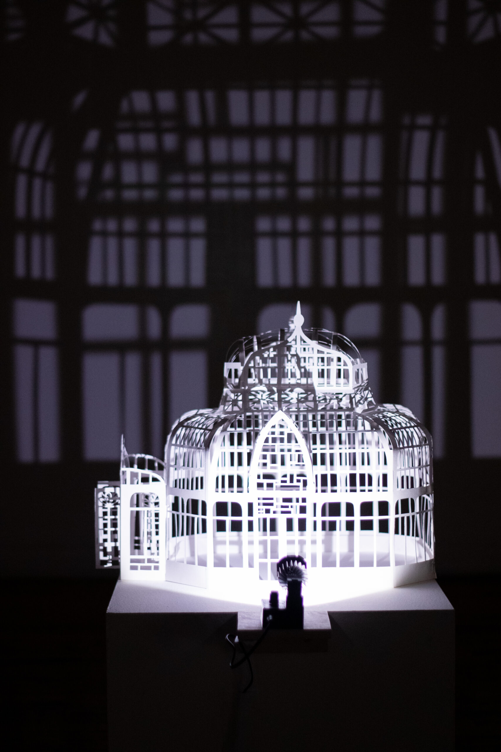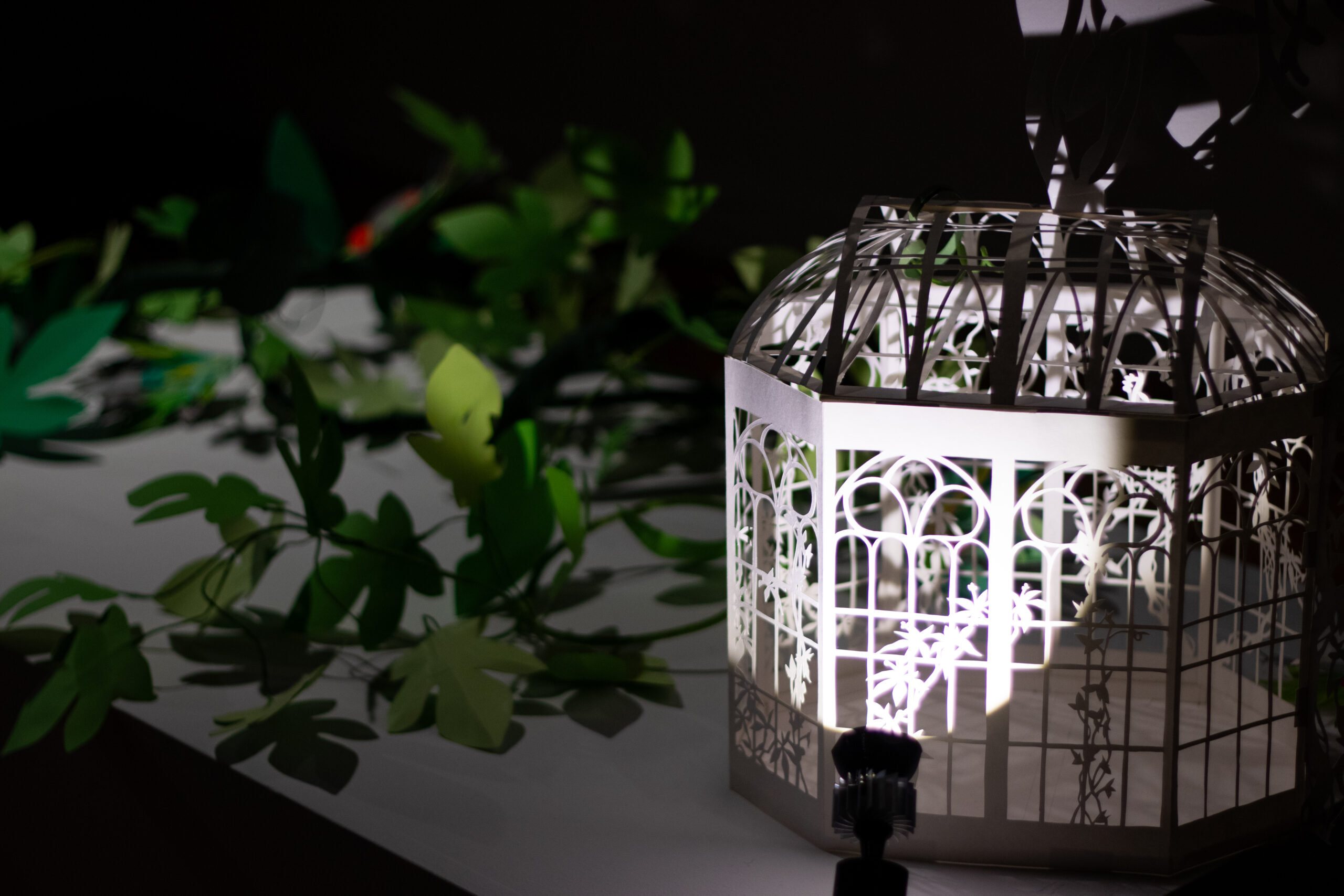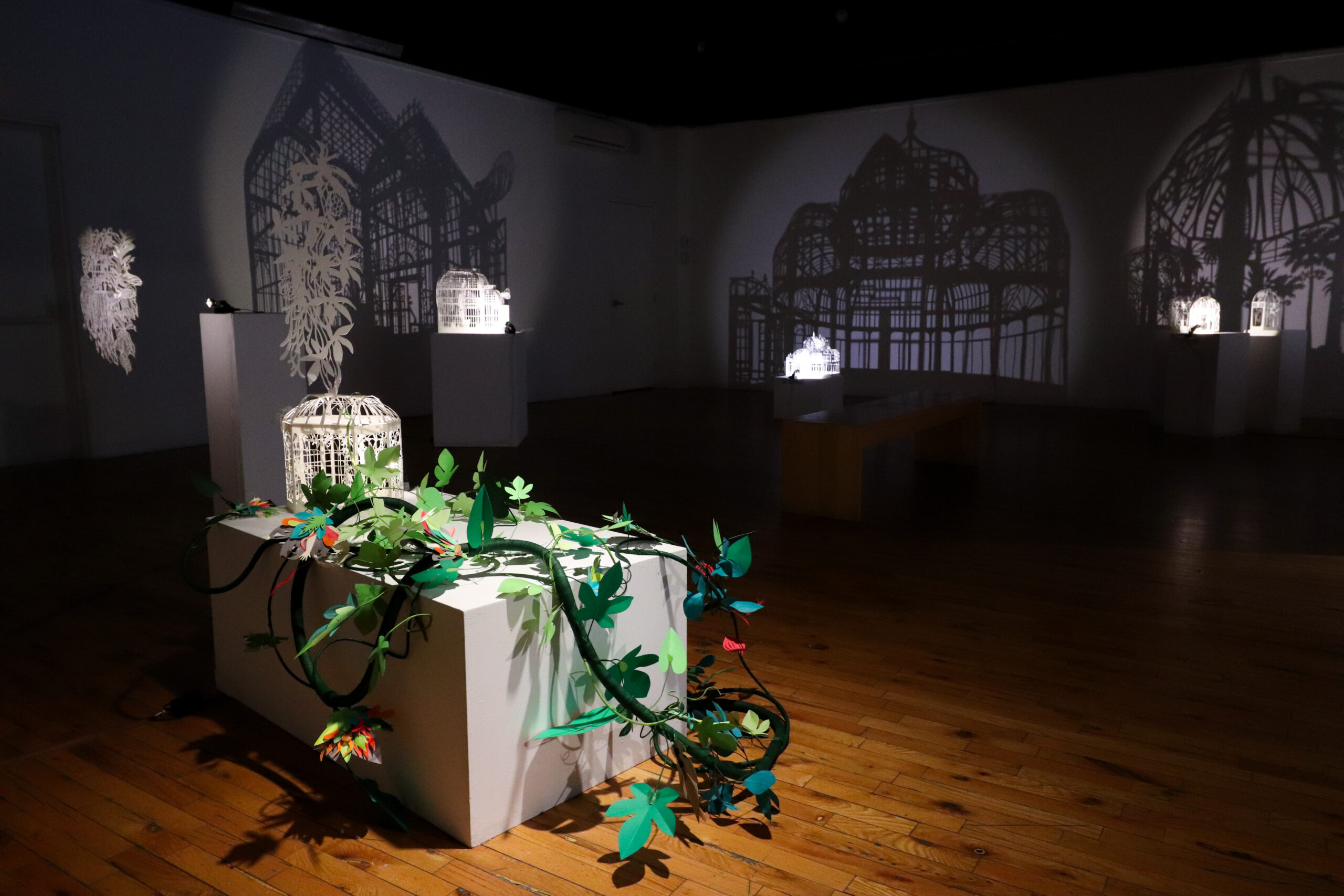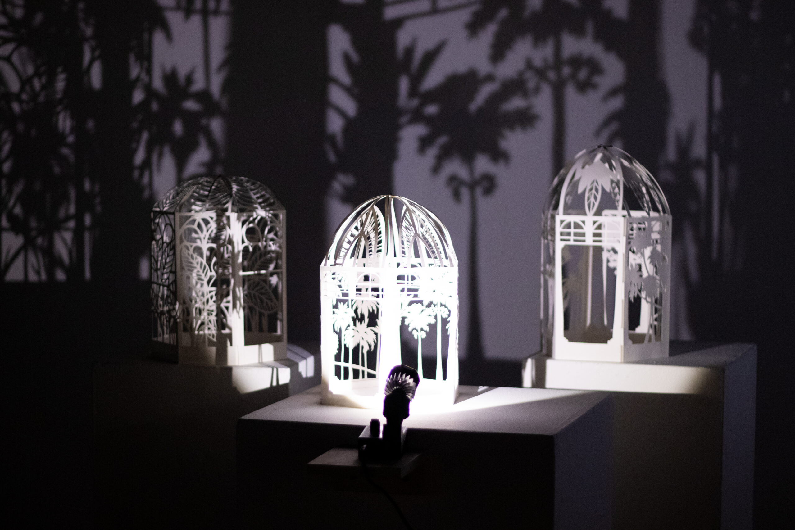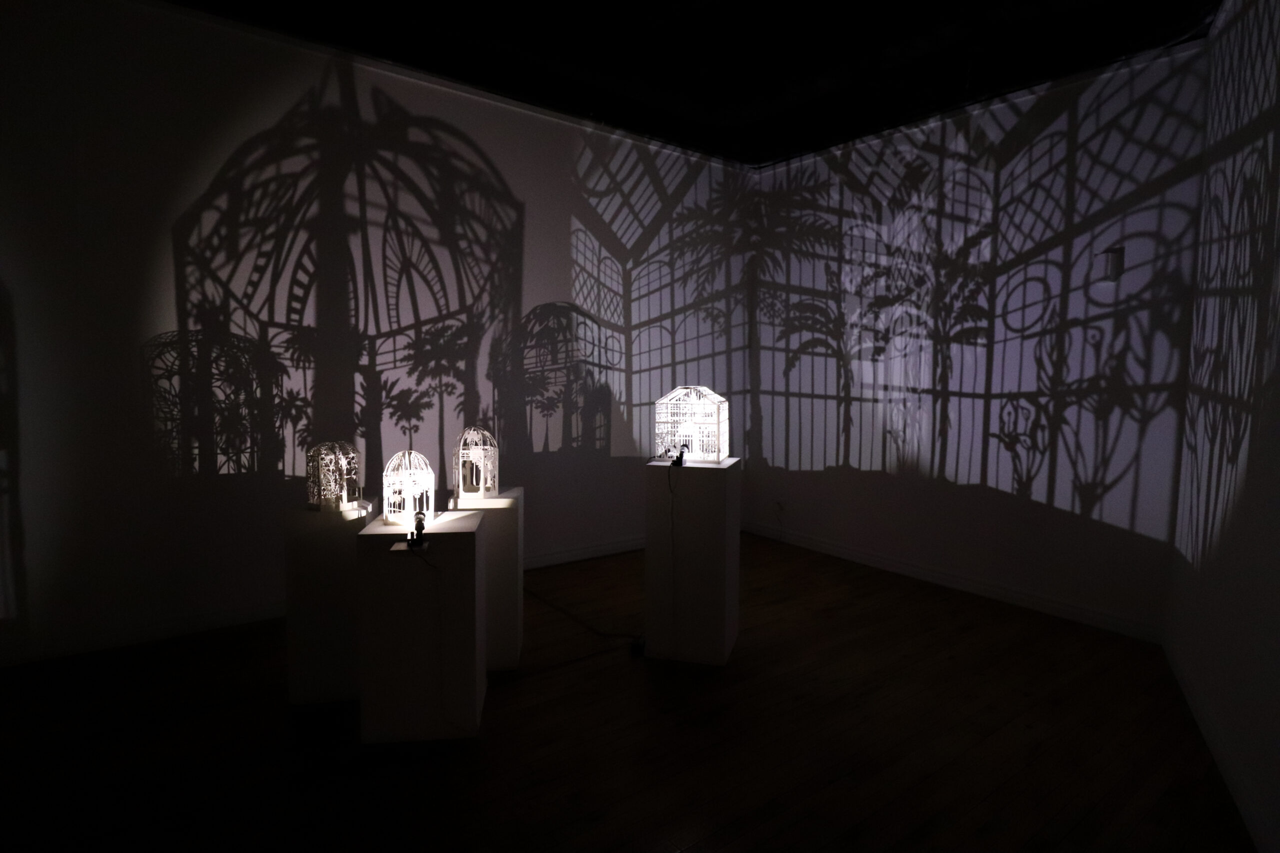 Winter Garden is a large-scale immersive shadow installation that explores historical structures built to possess and colonize plants from all over the world. First built in 19th-century Europe, winter gardens were structures made of cast iron and plate glass to house collections of exotic foliage. These indoor gardens served as a testament to the power and wealth of those with the means to possess them, and to the power and technological knowledge possessed by whomever built them. This exhibition at the McClure Gallery combines the delicacy of cut paper with imagery inspired by historical winter garden structures at two Montreal locations: The Verdun Greenhouses and the Montreal Botanical Gardens.