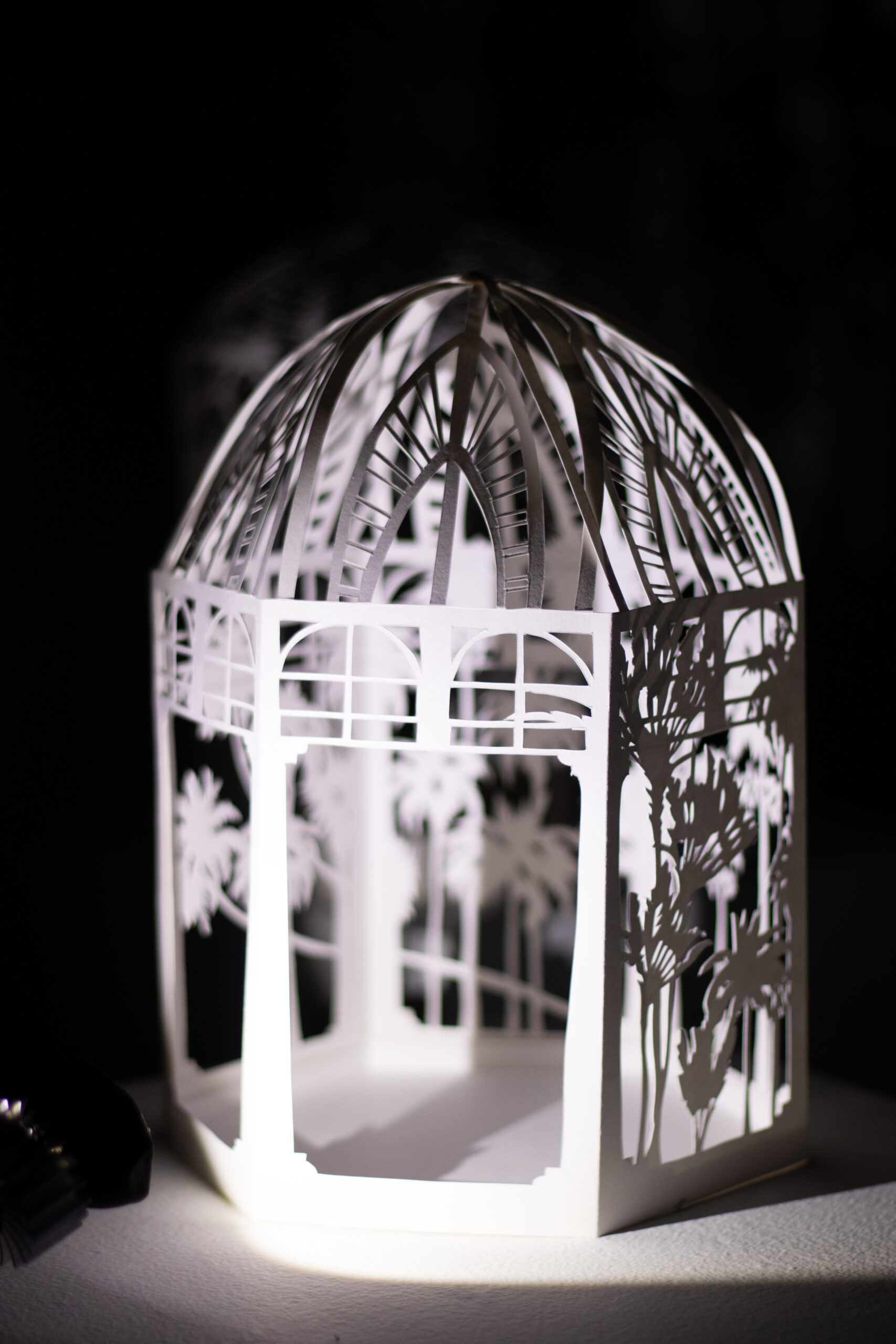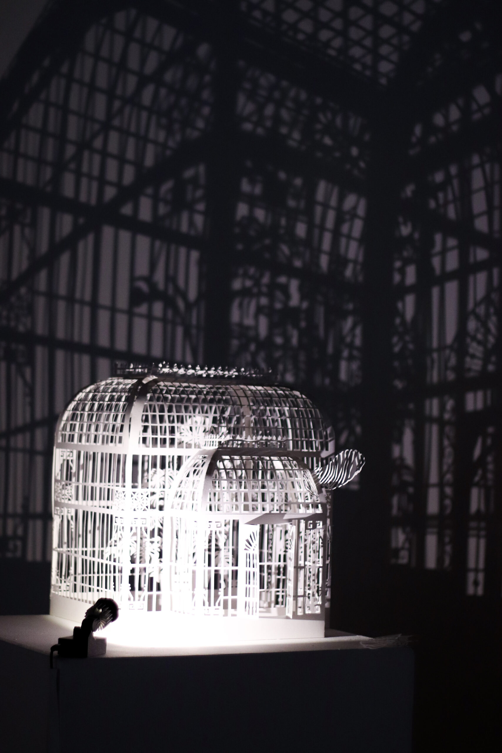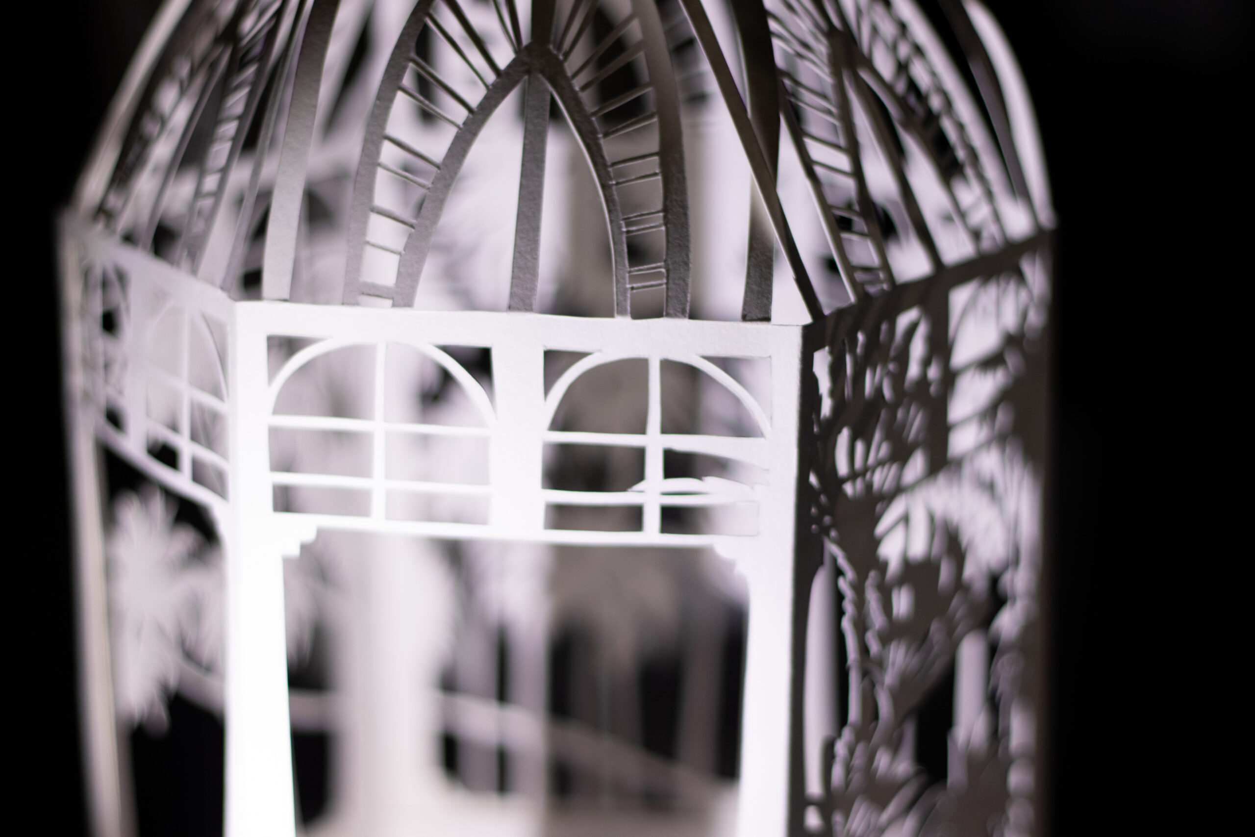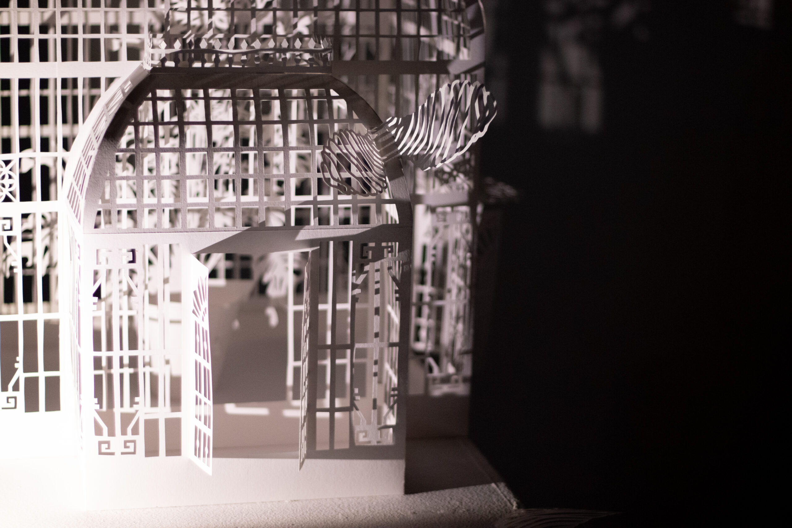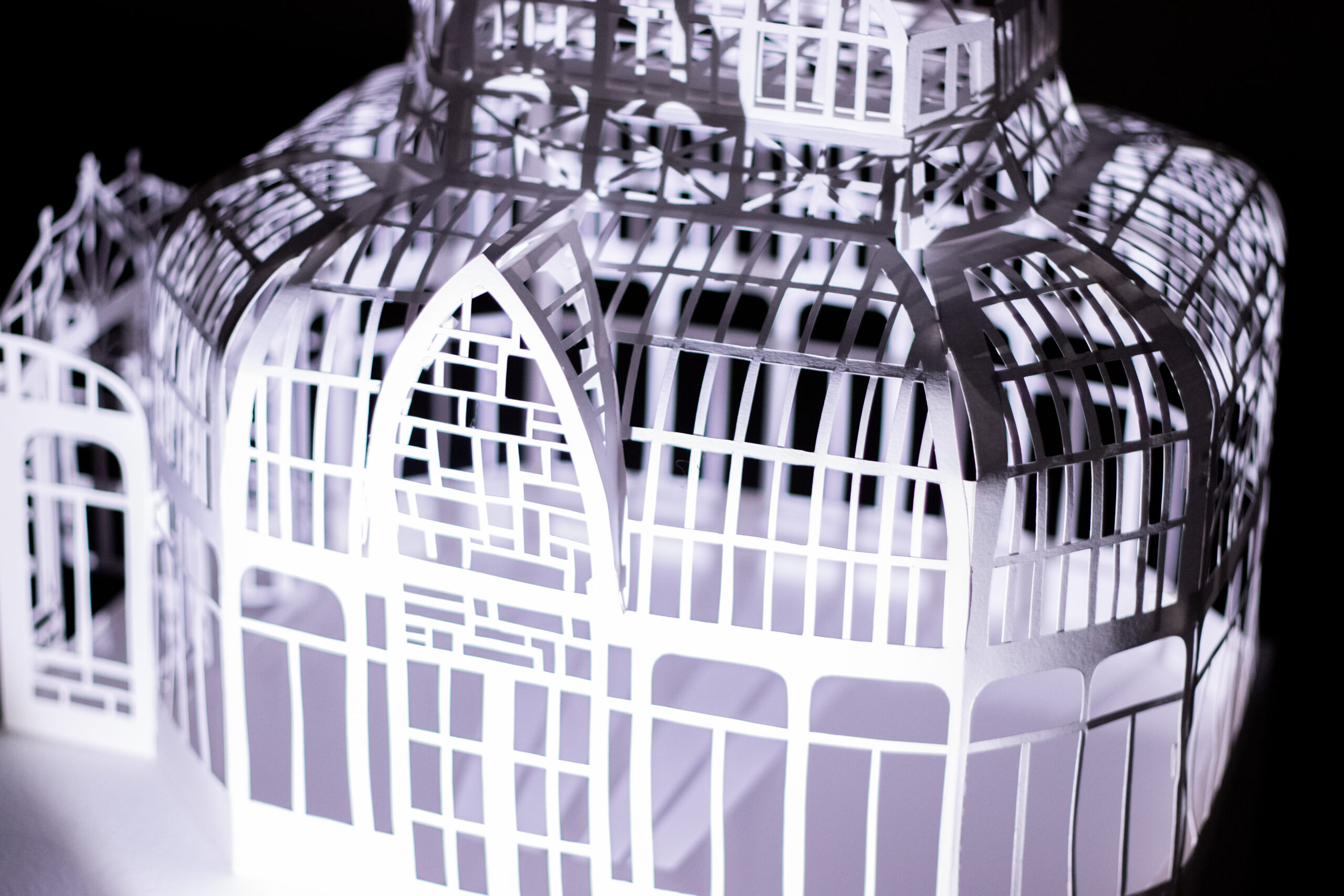 Winter Garden is a large-scale immersive shadow installation that explores historical structures built to possess and colonize plants from all over the world. First built in 19th-century Europe, winter gardens were structures made of cast iron and plate glass to house collections of exotic foliage. These indoor gardens served as a testament to the power and wealth of those with the means to possess them, and to the power and technological knowledge possessed by whomever built them. This exhibition at the McClure Gallery combines the delicacy of cut paper with imagery inspired by historical winter garden structures at two Montreal locations: The Verdun Greenhouses and the Montreal Botanical Gardens.